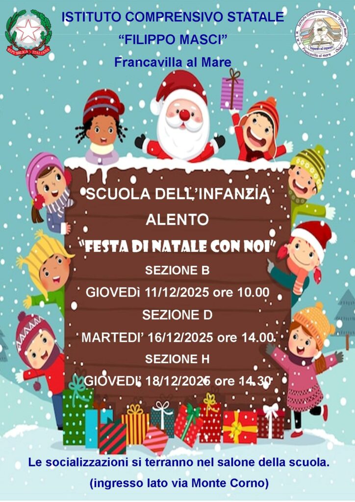 HomeSlide news In primo pianoFesta di Natale, scuola dell’Infanzia Festa di Natale, scuola dell’Infanzia Categorie In primo piano Slide news Data: 10/12/2025 Nell'atmosfera magica che si vive in questi giorni, i nostri piccoli alunni delle scuole dell'Infanzia Alento e Fontechiaro sono pronti ed entusiasti a condividere con voi la magia del Natale! Invito alla presentazione del concorso Giorgio Acerra